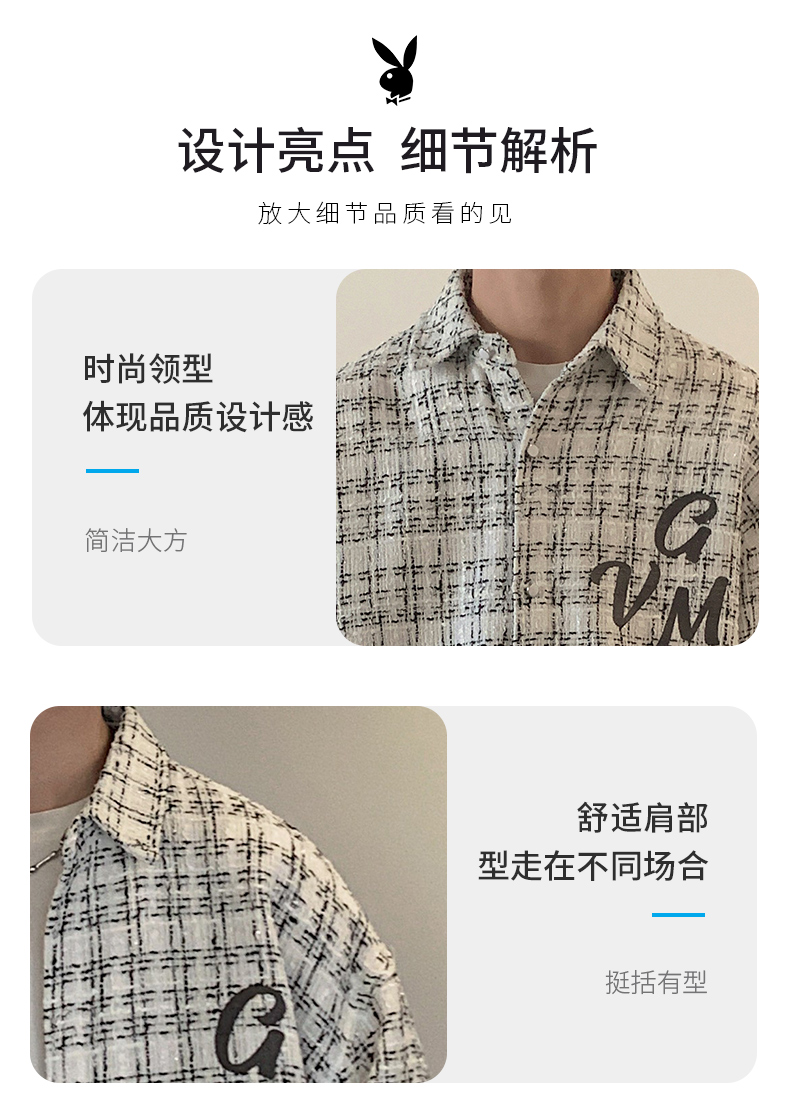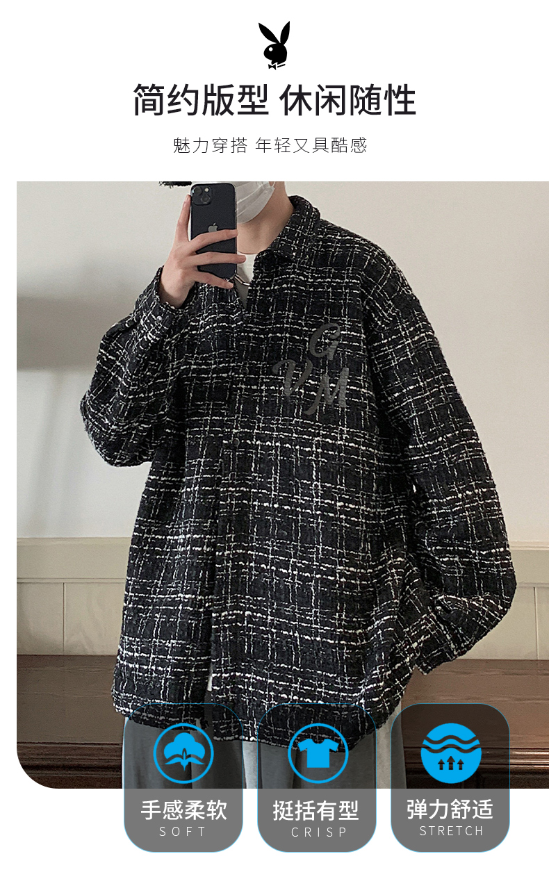 花花公子长袖衬衫男2023秋季潮牌宽松翻领衬衣男士休闲格子上衣服的描述
